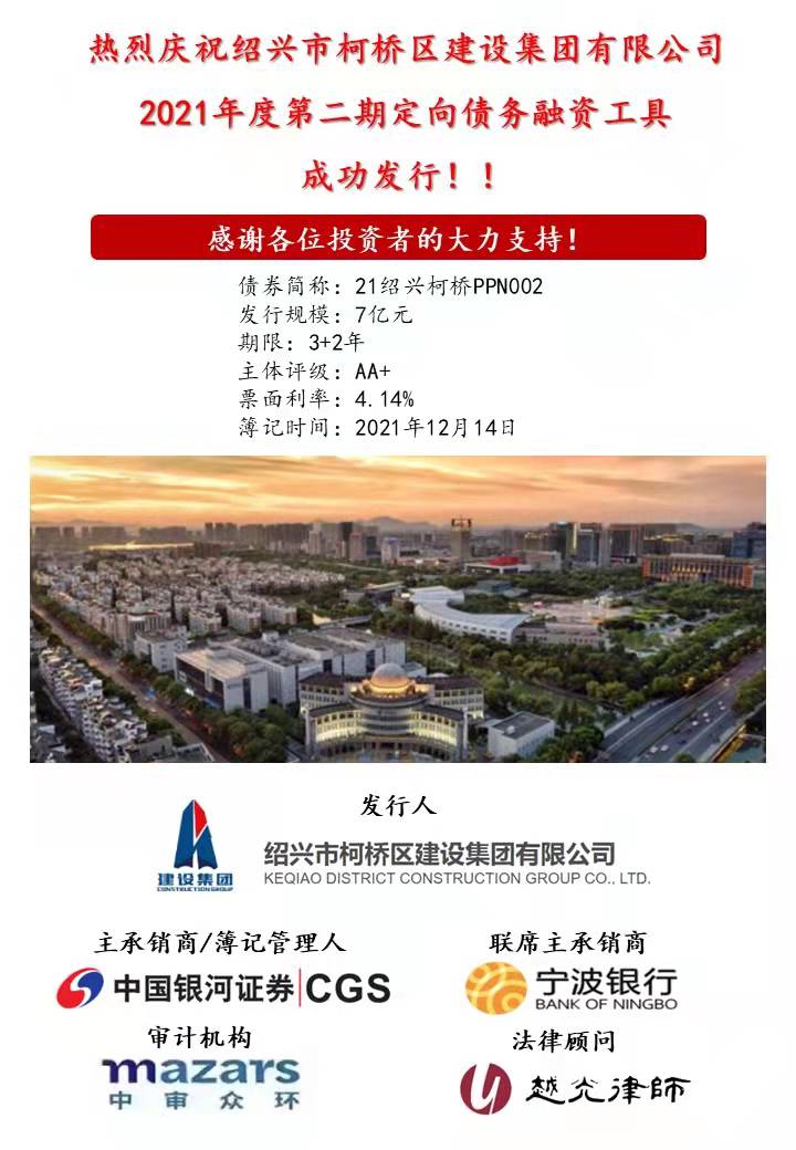 12月14日,紹興市柯橋區(qū)建設(shè)集團(tuán)有限公司2021年第二期定向債務(wù)融資工具成功簿記建檔,規(guī)模7億元,期限3+2年,AA+主體無(wú)擔(dān)保,票面利率4.14%。